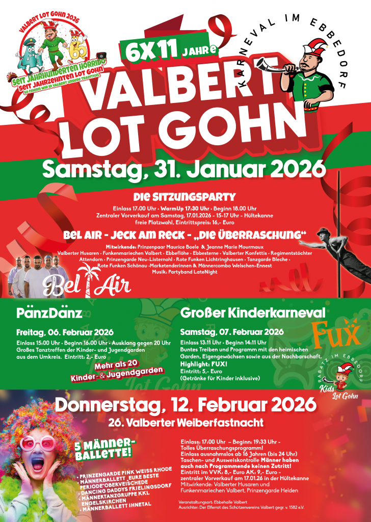 Nicht mehr lang und mit Glockschlag 11:11 Uhr starten wir am 11. November in das Jubiläumsjahr, denn im Jahr 1960 fand erstmals eine Karnevalssitzung unter dem Motto „Valbert Lot Gohn“ in unserem Dorf statt. Seitdem hat sich in den letzten 66 Jahren verdammt viel getan.