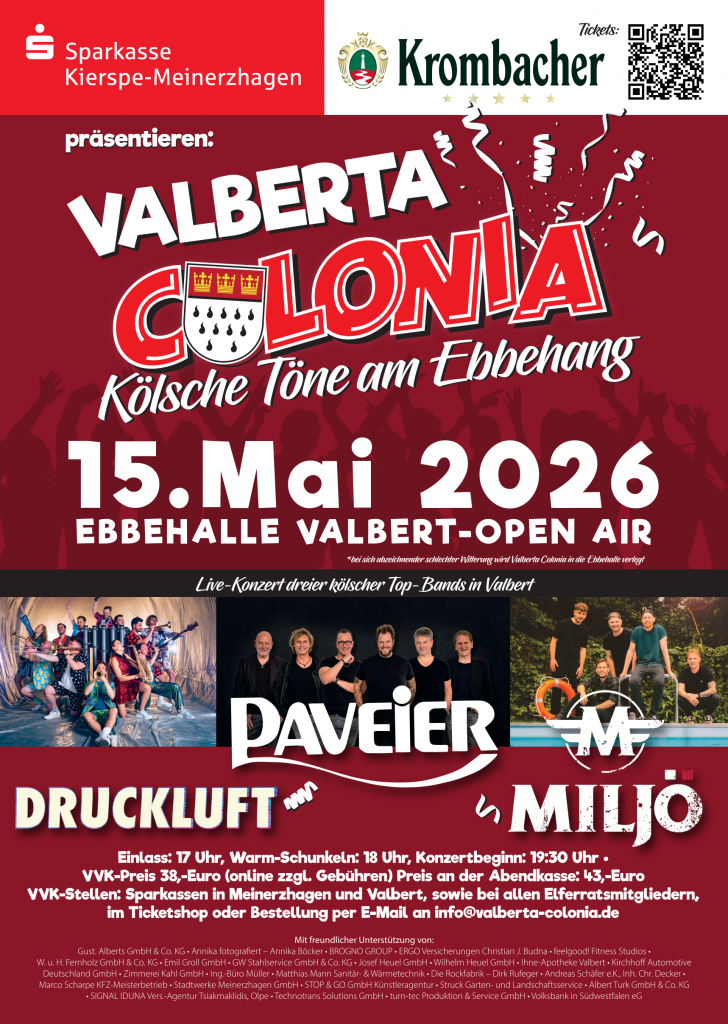 Wir freuen uns auf „Valberta Colonia – Kölsche Töne am Ebbehang“ am Freitag, 15. Mai 2026 an der Ebbehalle.