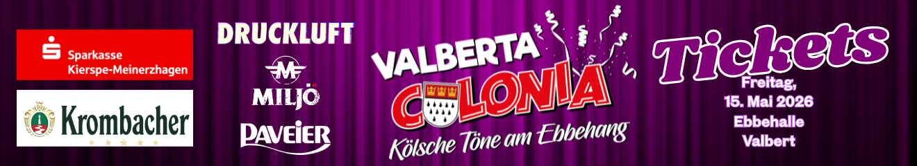 Frühbucherphase vom 11.11.-31.12.2025: Eintrittskarten sind zum dann günstigsten Preis von 33,- Euro erhältlich. Ihr könnt Karten zum Frühbucherpreis hier in unserem Online-Ticketshop erwerben, alternativ per Mail an info@valberta-colonia.de oder beim Elferrat. Wir melden uns dann bei Bestellungen per Mail oder bei den Elferratsmitgliedern bei Euch.