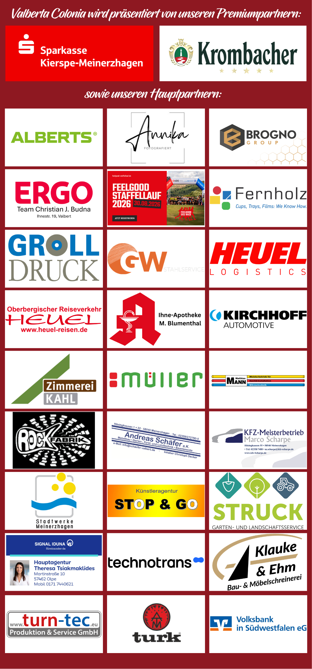 Ohne diese großartige Unterstützung so zahlreicher Freunde und Gönner wäre „Valberta Colonia“ nicht darstellbar. Wir sind zutiefst dankbar und bedanken uns bei unseren Parnern und Sponsoren.