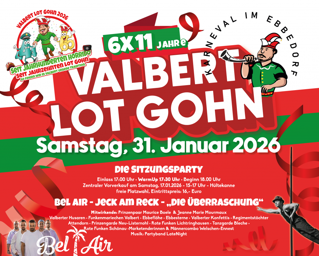 Am Samstag, 31.01.2026 heißt es wieder „Valbert Lot Gohn“ in der Ebbehalle.